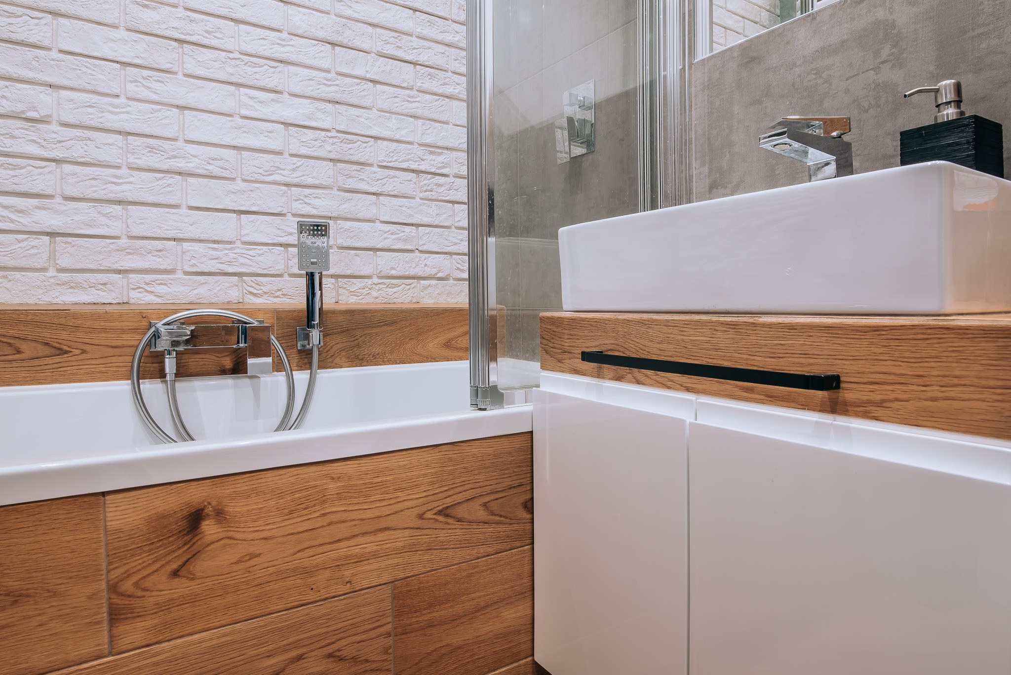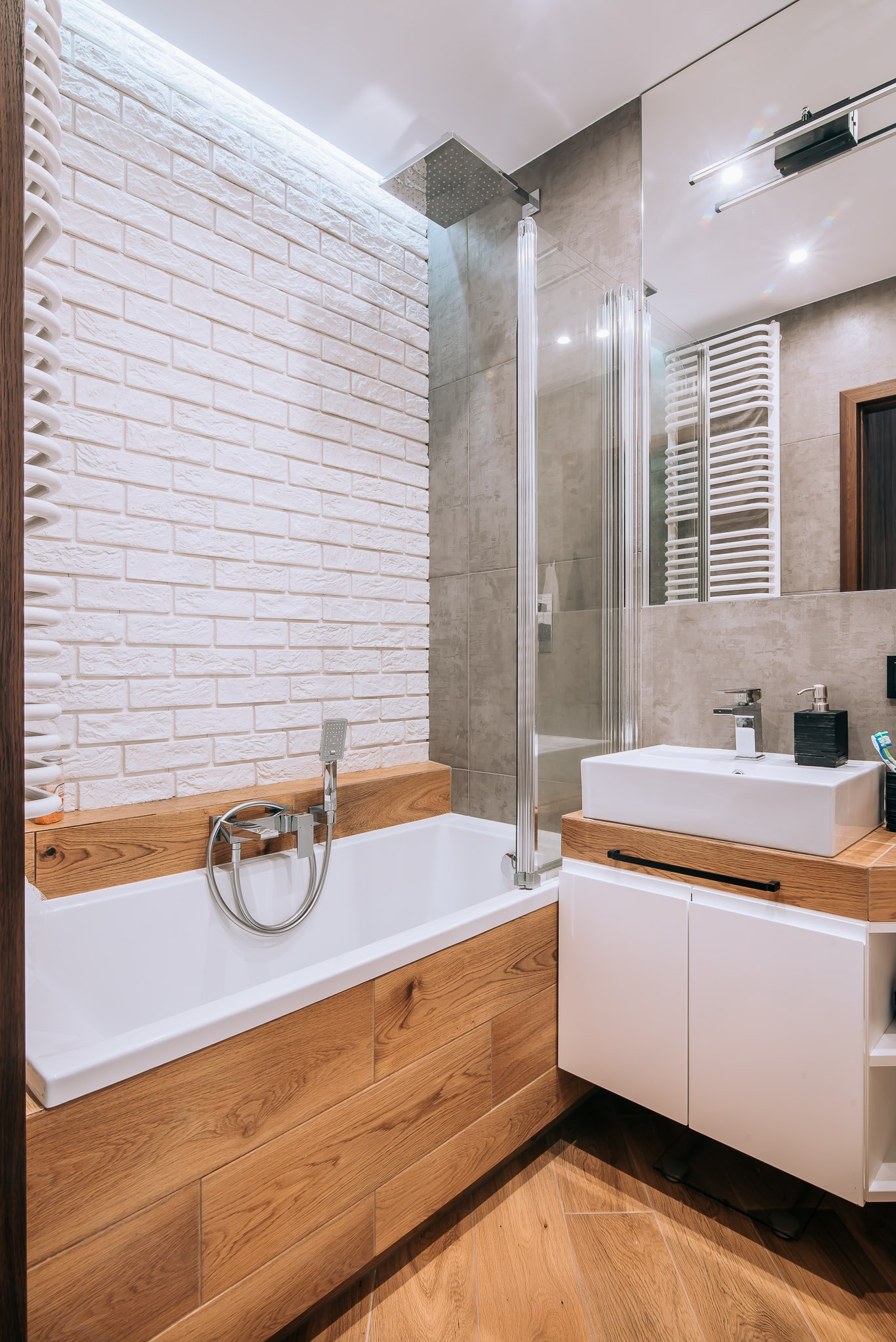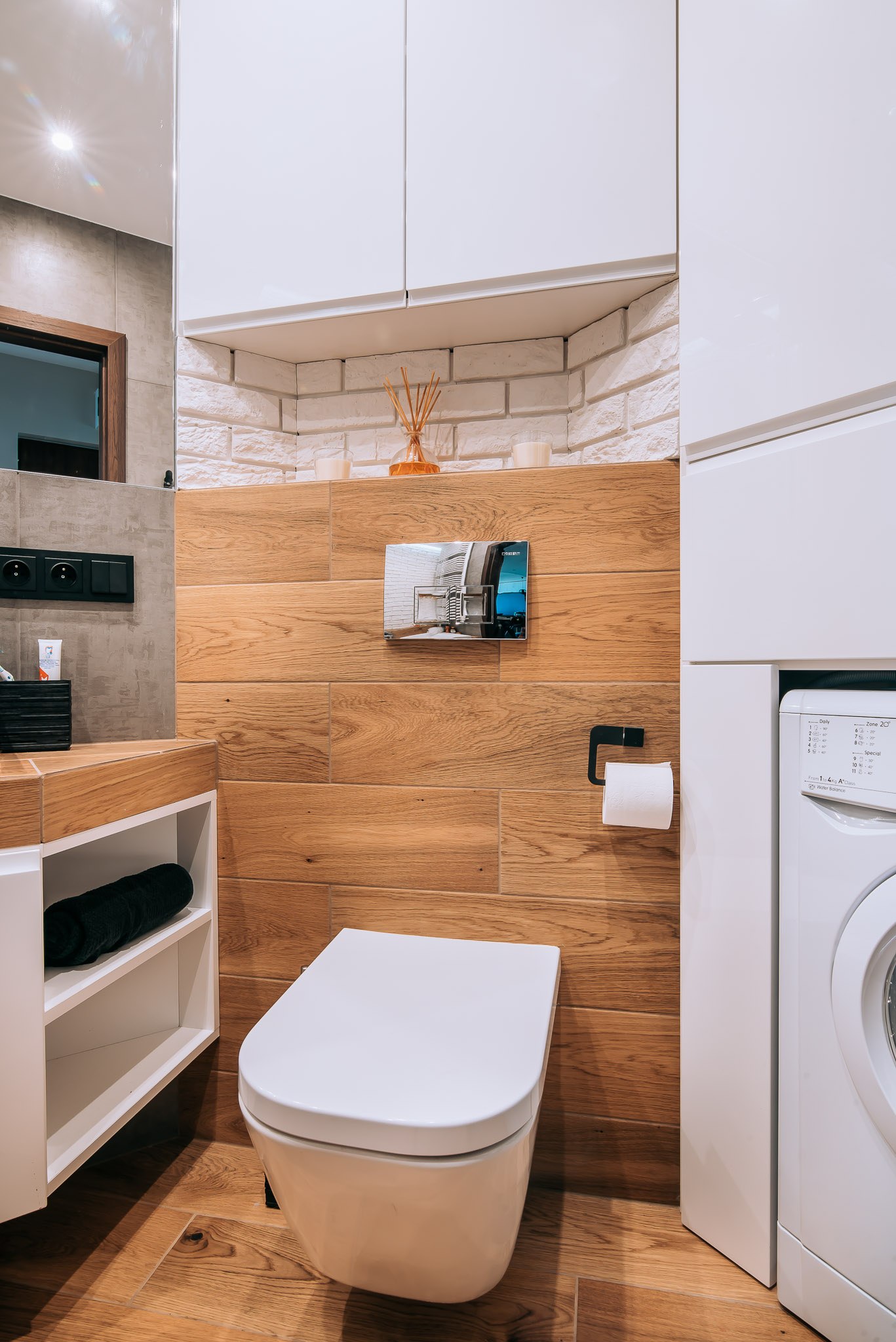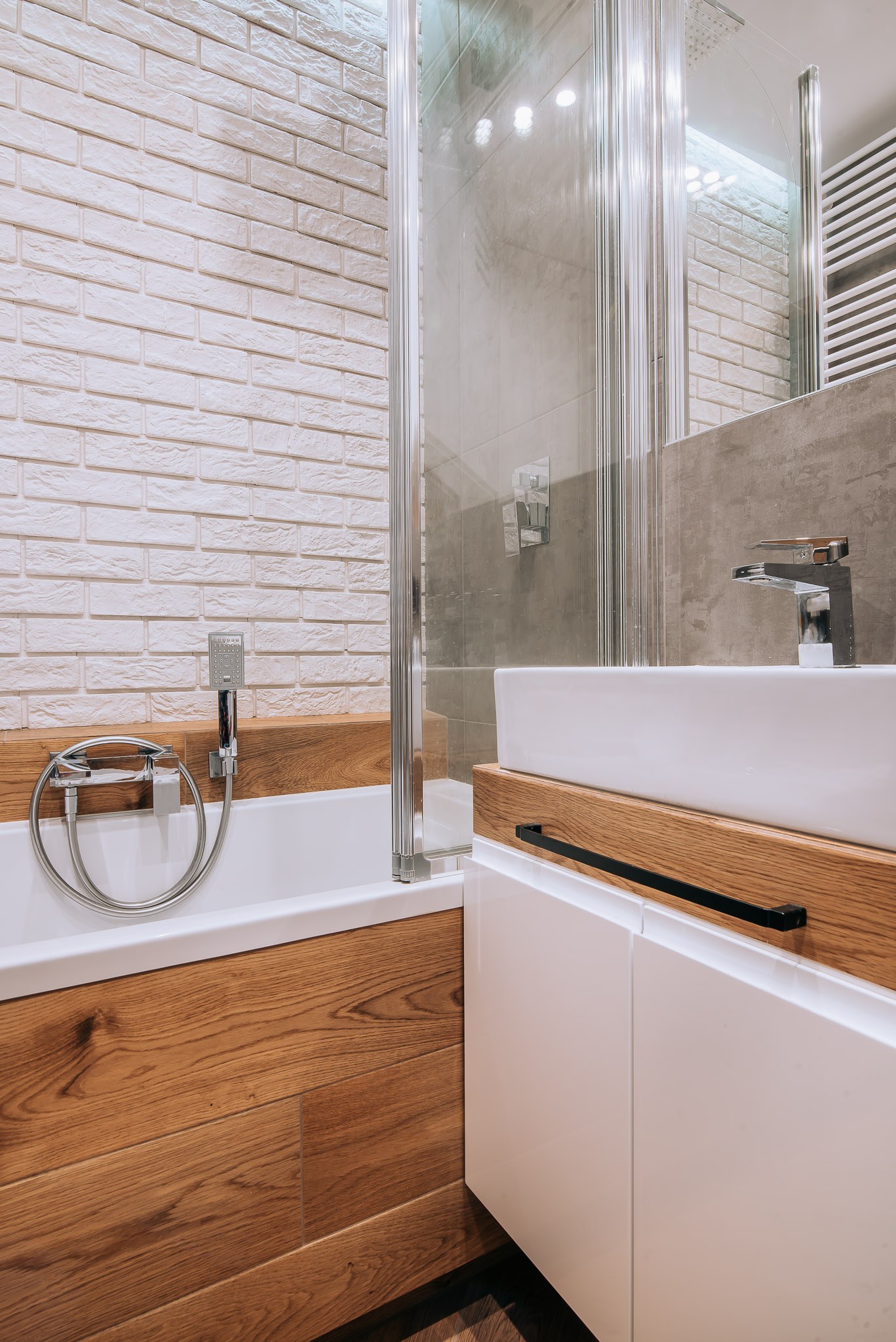 Nieduża łazienka w której został wykorzystany wykorzystać każdy centymetr. Wykorzystane tutaj zostało klasyczne połączenie: jasne kolory plus gres drewnopodobny. Dzięki zmianie ustawienia miski sedesowej pod odpowiednim kątem, udało się wydzielić dodatkowe miejsce, które zostało wykorzystane na zabudowę i miejsce na pralkę. Na ścianie zostały zamontowane specjalnie wykonane odporne panele imitujące cegłę.