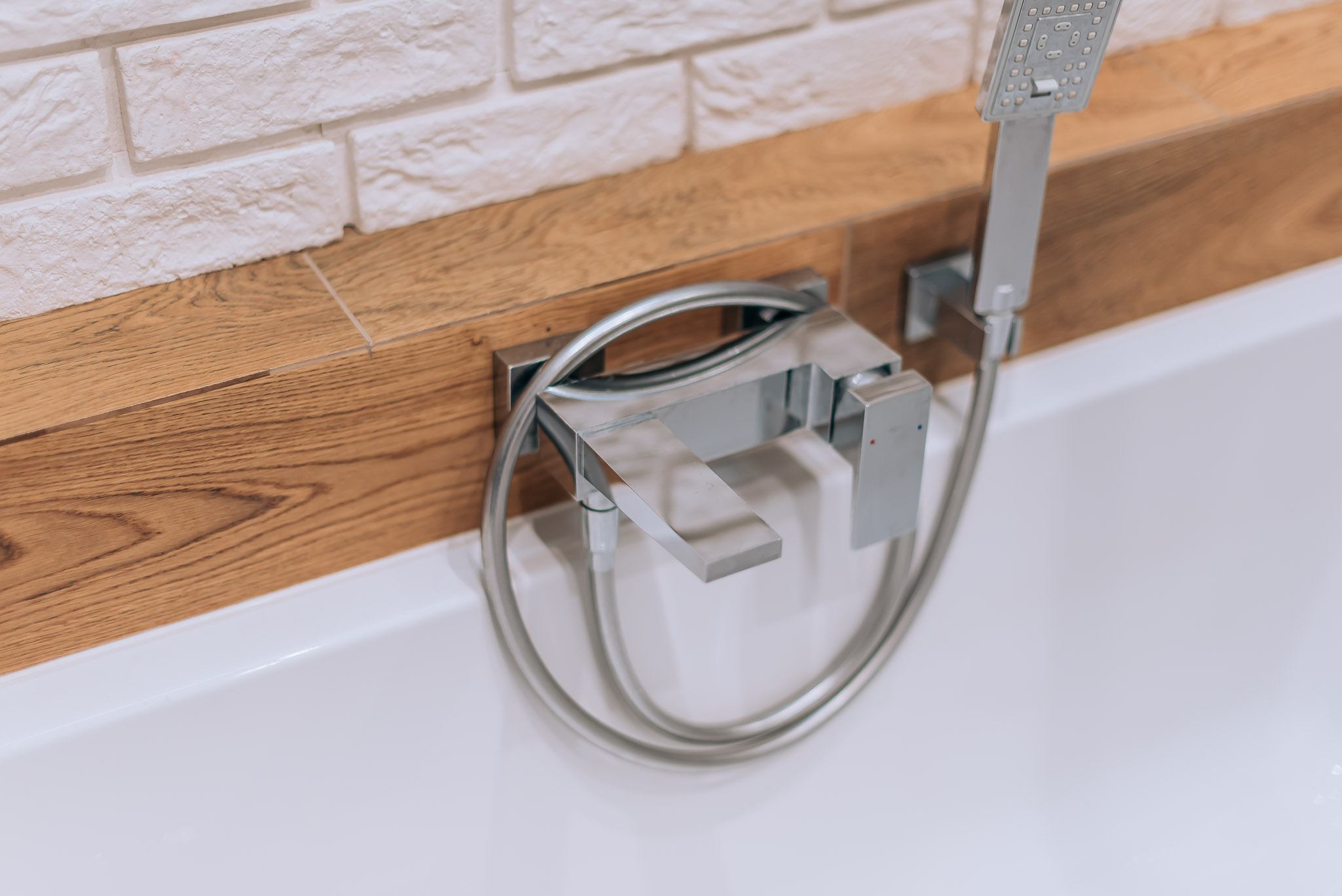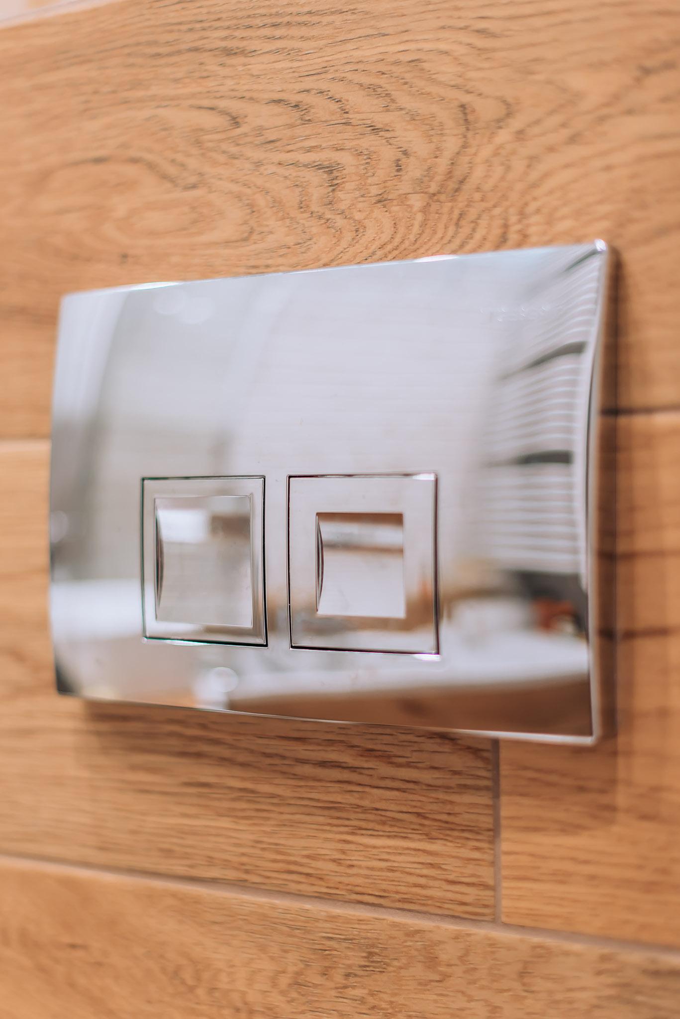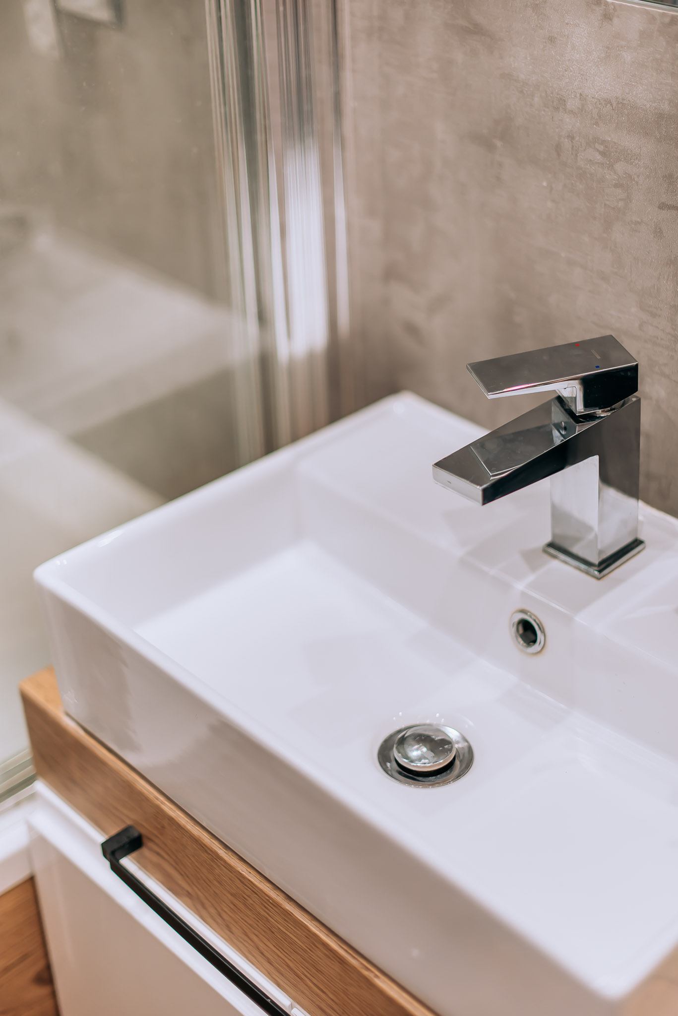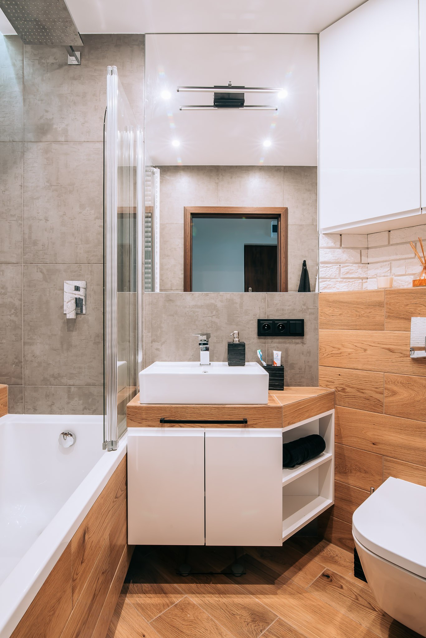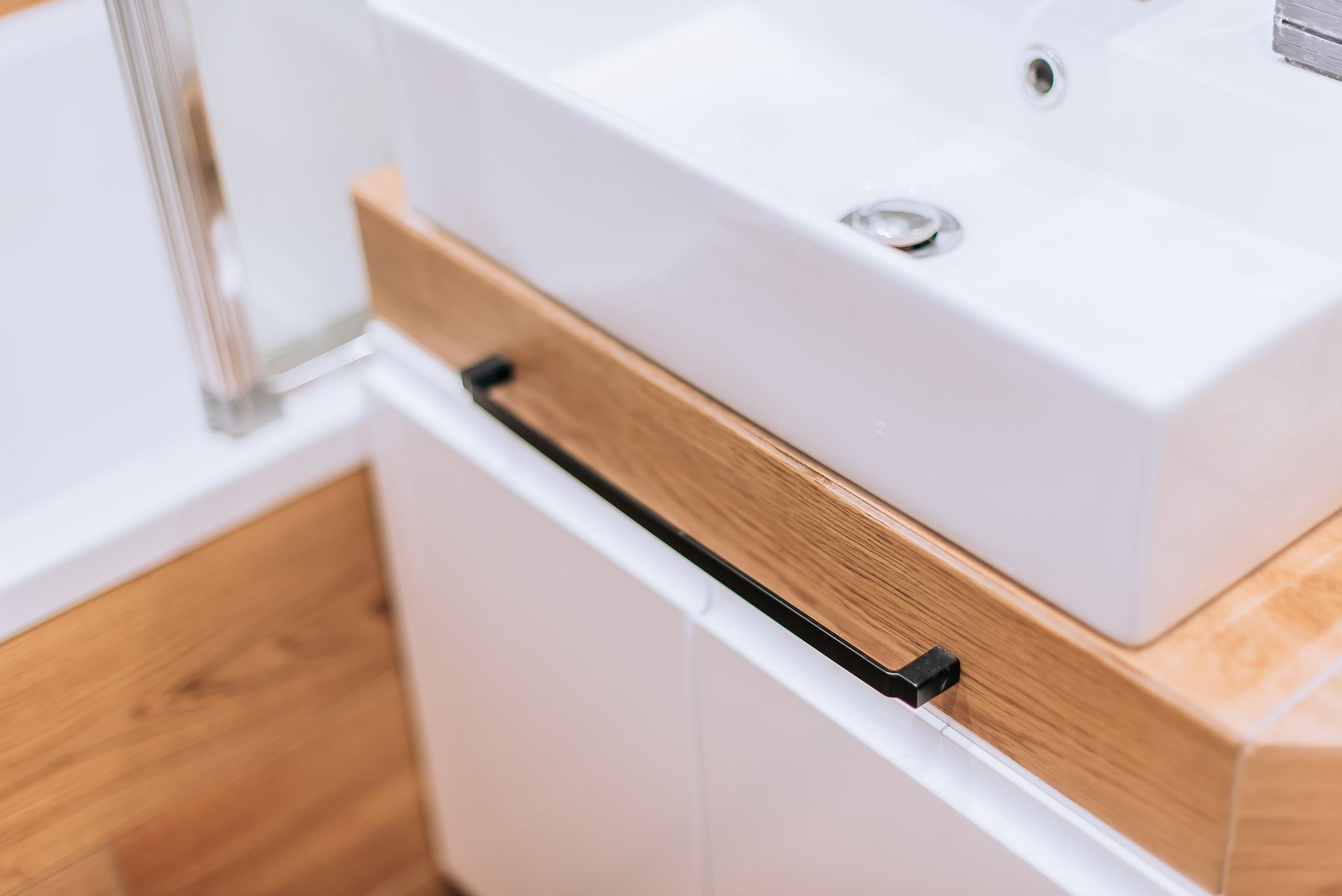 Nieduża łazienka w której został wykorzystany wykorzystać każdy centymetr. Wykorzystane tutaj zostało klasyczne połączenie: jasne kolory plus gres drewnopodobny. Dzięki zmianie ustawienia miski sedesowej pod odpowiednim kątem, udało się wydzielić dodatkowe miejsce, które zostało wykorzystane na zabudowę i miejsce na pralkę. Na ścianie zostały zamontowane specjalnie wykonane odporne panele imitujące cegłę.