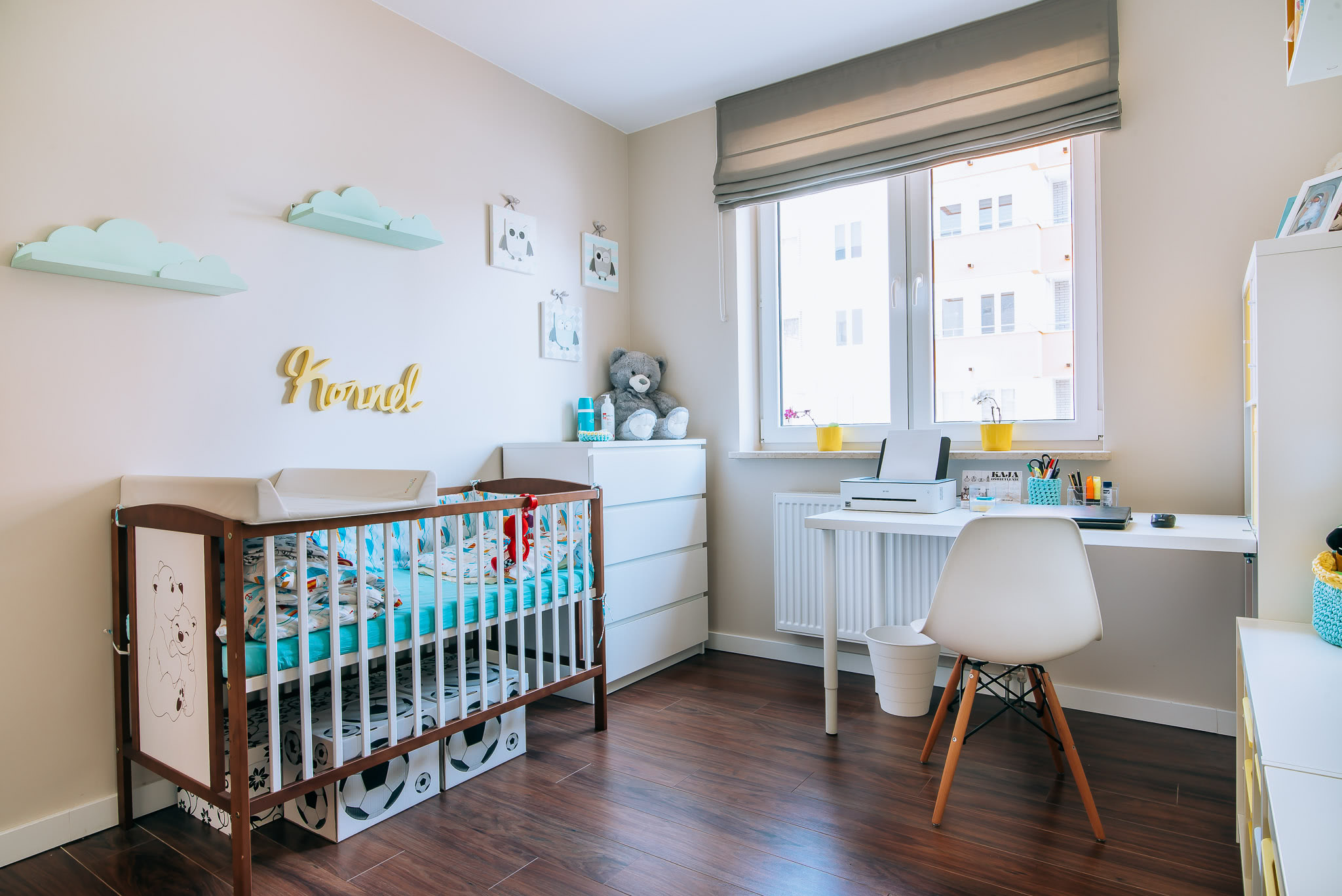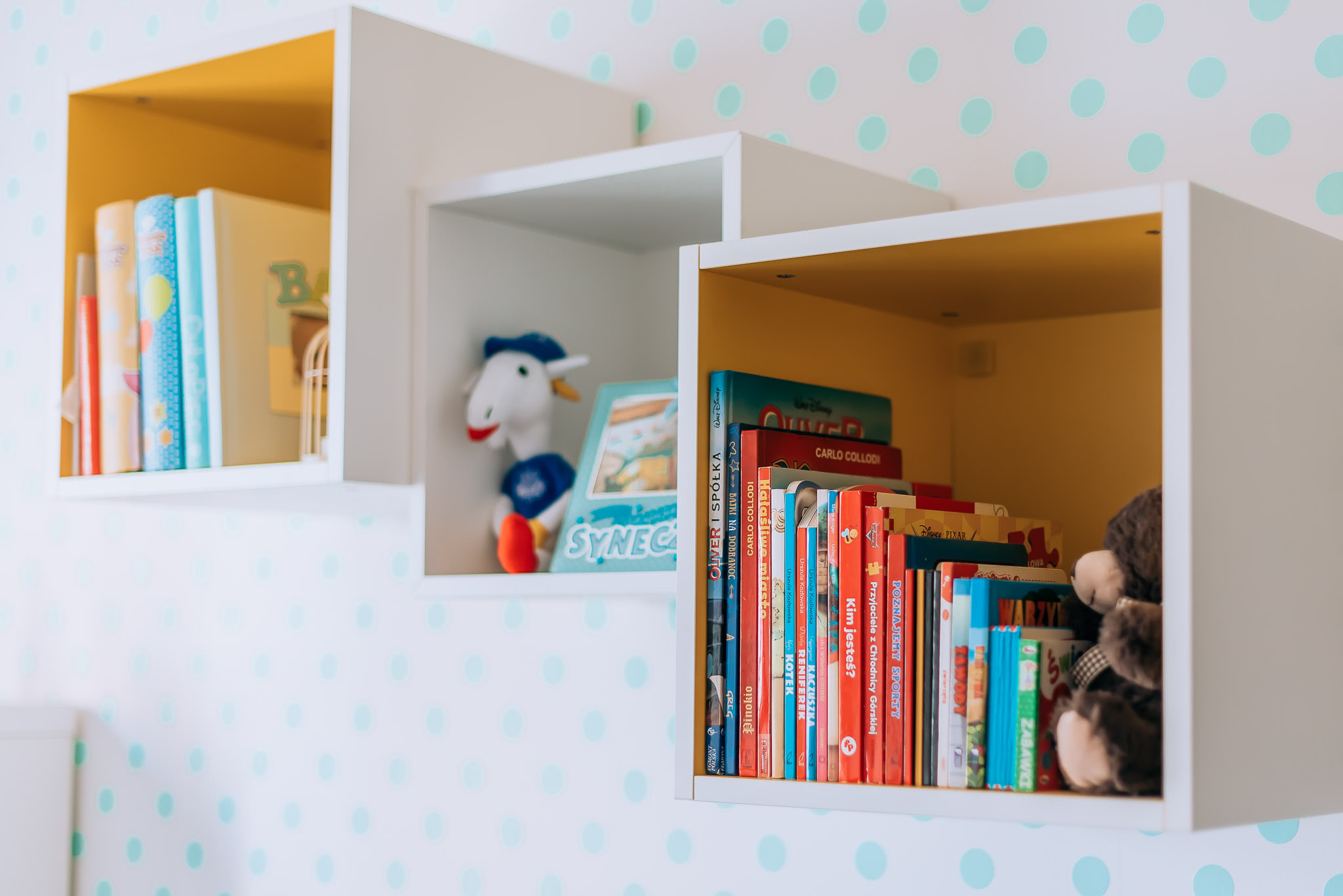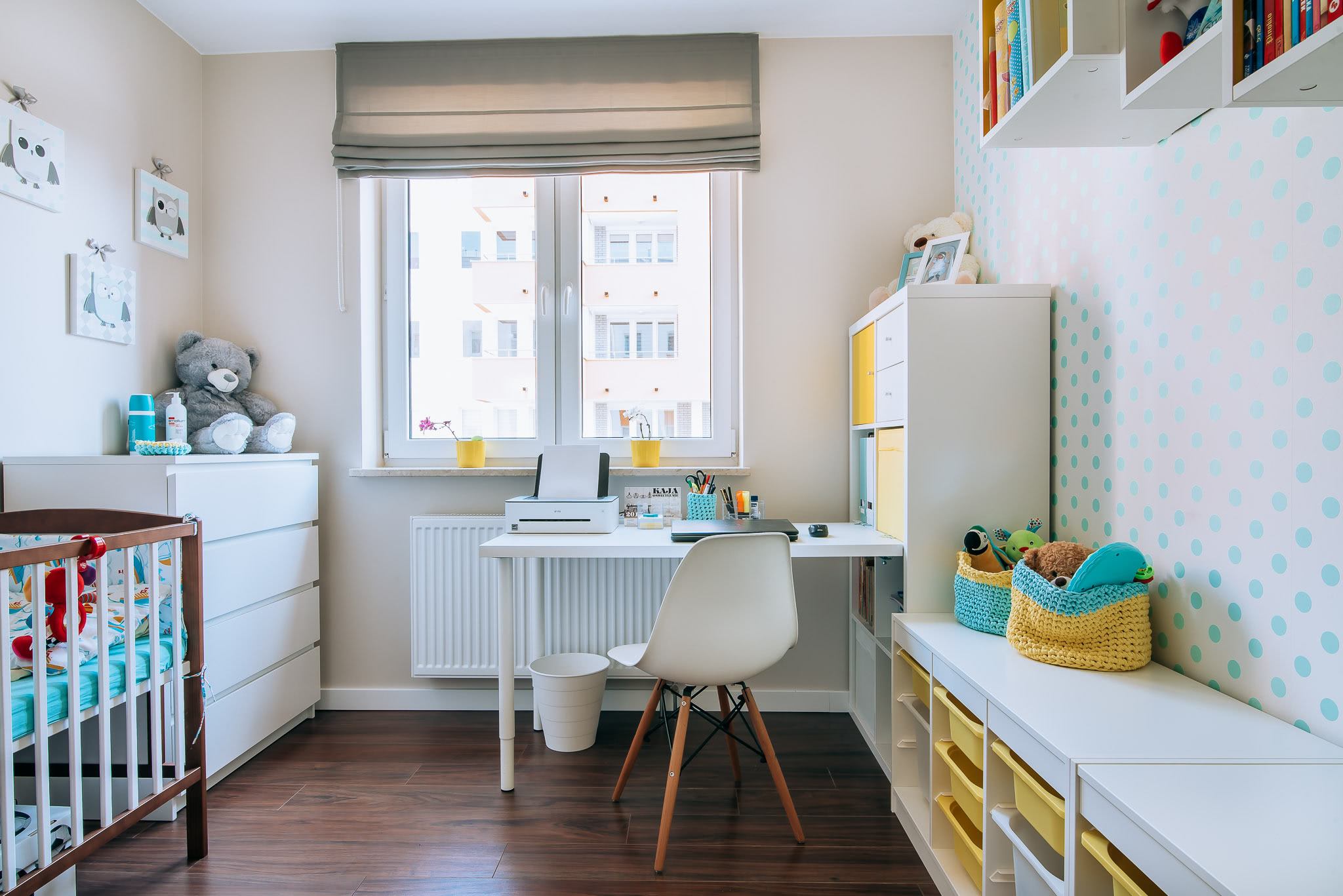 Pokój dla małego niespełna rocznego chłopca. Radosna kolorystyka i dużo miejsca na przechowywanie zabawek. Meble zostały tak dobrane, by łatwo było je wymienić lub dokupić nowe. Kolorowa tapeta jest delikatnym akcentem na długiej ścianie. Pokój ma rosnąć z dzieckiem, jednoczenie zanim chłopiec urośnie rodzice będą korzystać z biurka jako tymczasowe miejsce do pracy zdalnej.