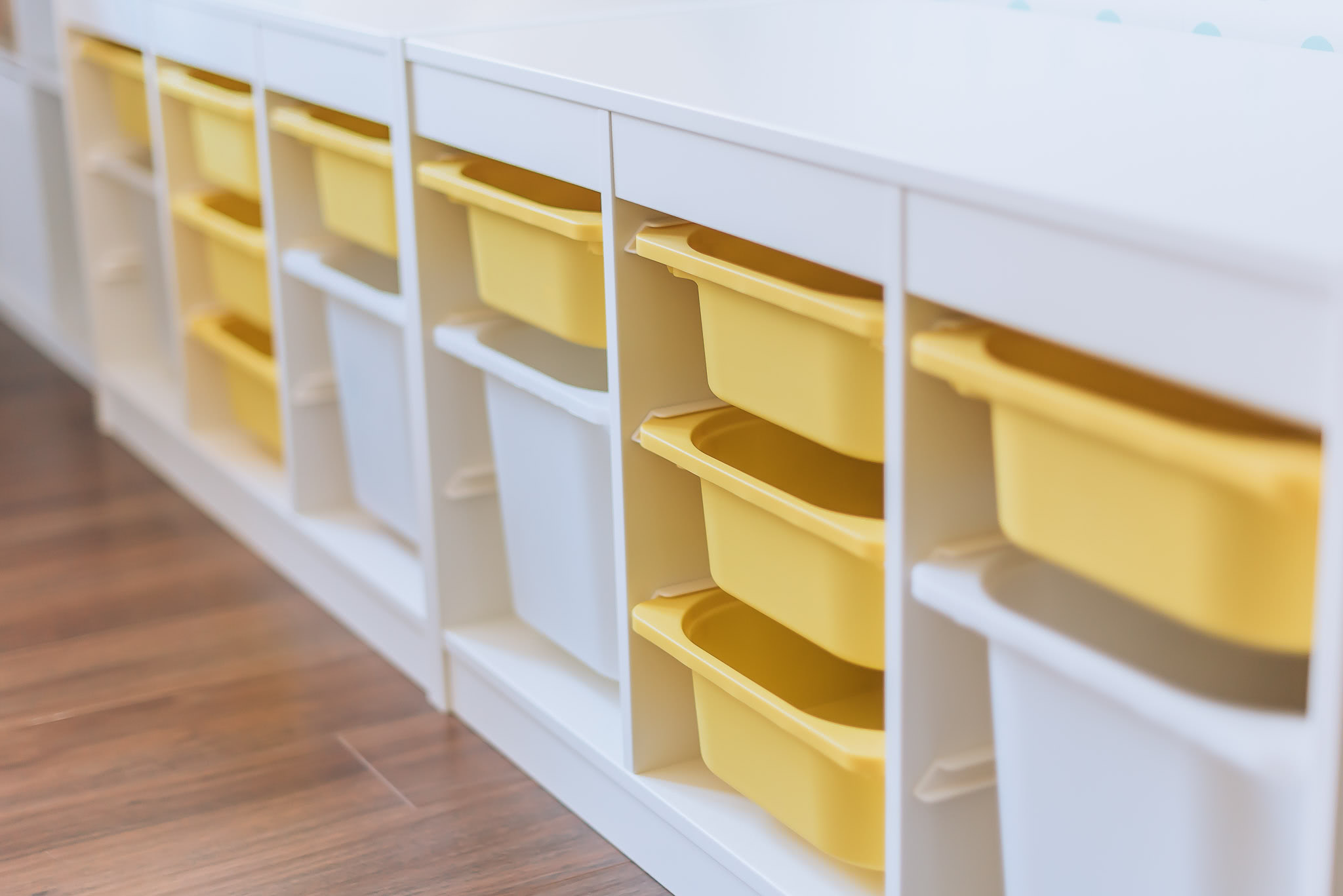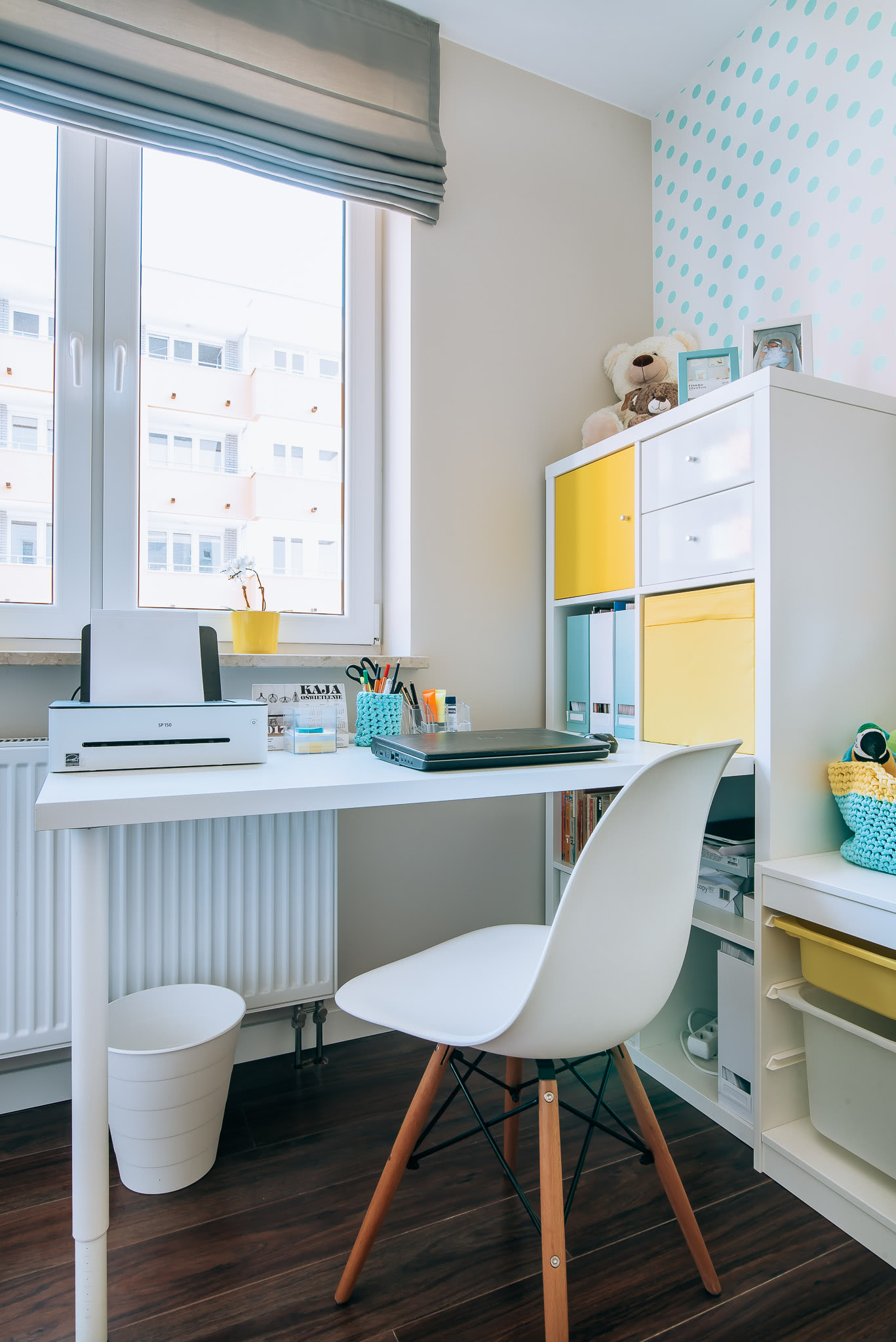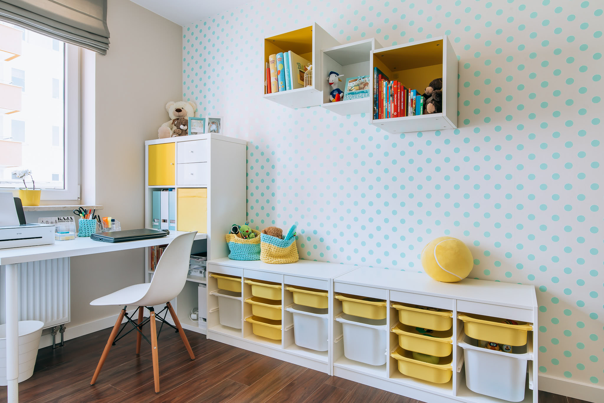 Pokój dla małego niespełna rocznego chłopca. Radosna kolorystyka i dużo miejsca na przechowywanie zabawek. Meble zostały tak dobrane, by łatwo było je wymienić lub dokupić nowe. Kolorowa tapeta jest delikatnym akcentem na długiej ścianie. Pokój ma rosnąć z dzieckiem, jednoczenie zanim chłopiec urośnie rodzice będą korzystać z biurka jako tymczasowe miejsce do pracy zdalnej.