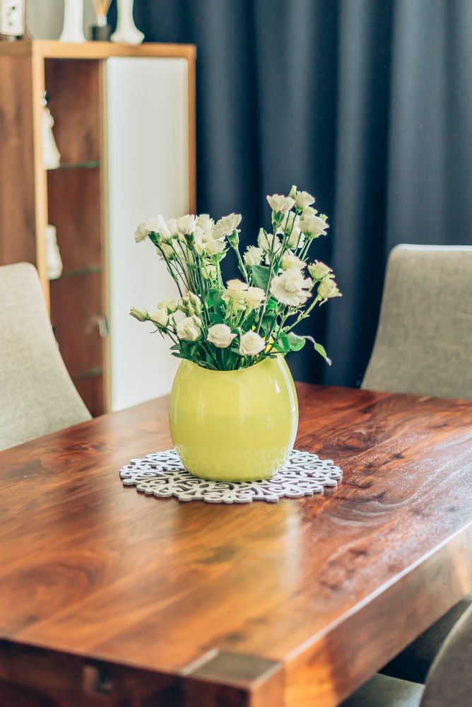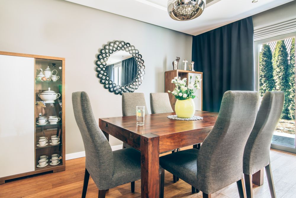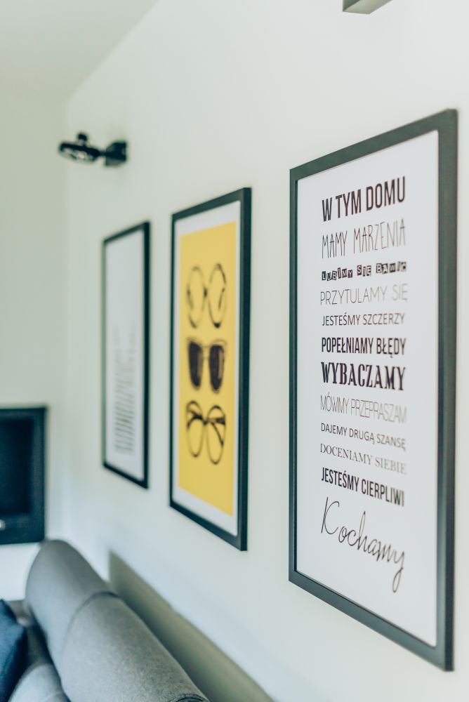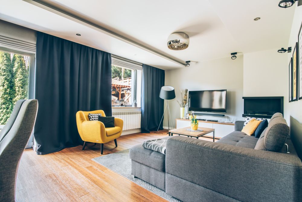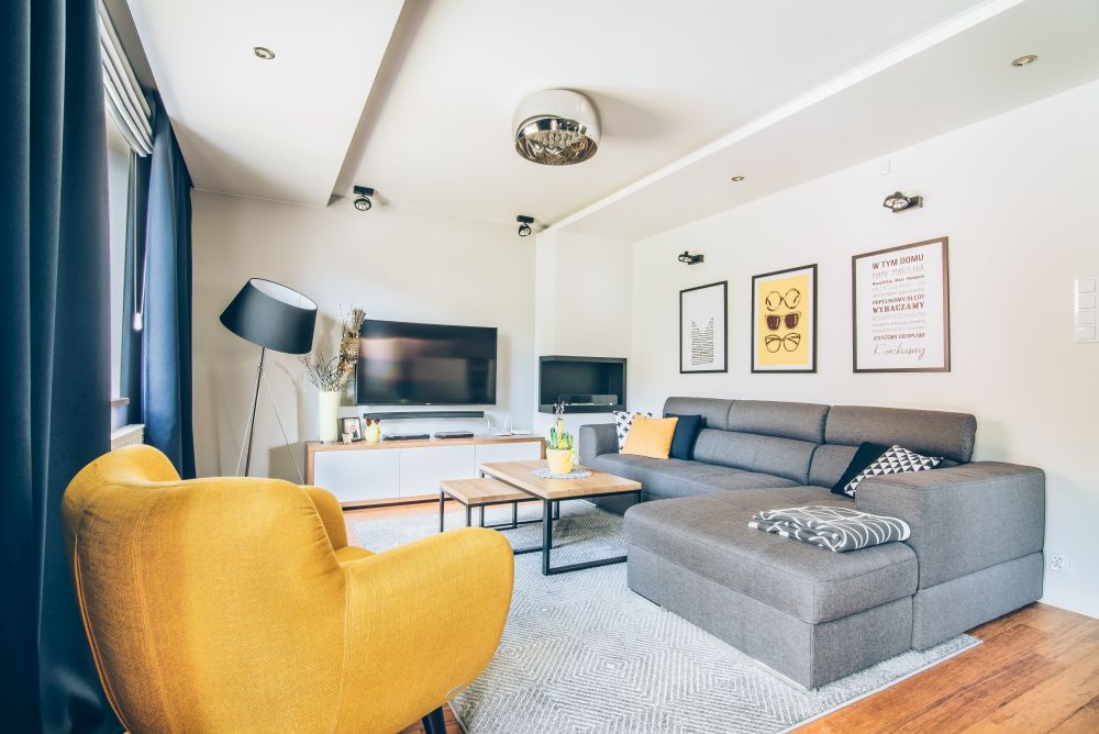 Duży salon połączony z jadalnią. Wnętrze pełniące funkcję jadalni i salonu, w którym znalazł się duży drewniany stół. W części salonu, gdzie stoi duży narożnik, wygospodarowano na ścianie miejsce na biokominek. Dodatki zostały dobrane tak, by nadać odpowiedni charakter wnętrza. Głównym akcentem kolorystycznym jest żółty fotel 'uszak'. Piękne zasłony w oknach oraz rolety rzymskie sprawiają, że wnętrze jest przytulne i ciepłe. Dom zbudowany w latach 90 tych, wymagał dokładnej modernizacji i na nowo projektowania aranżacji poszczególnych pomieszczeń.