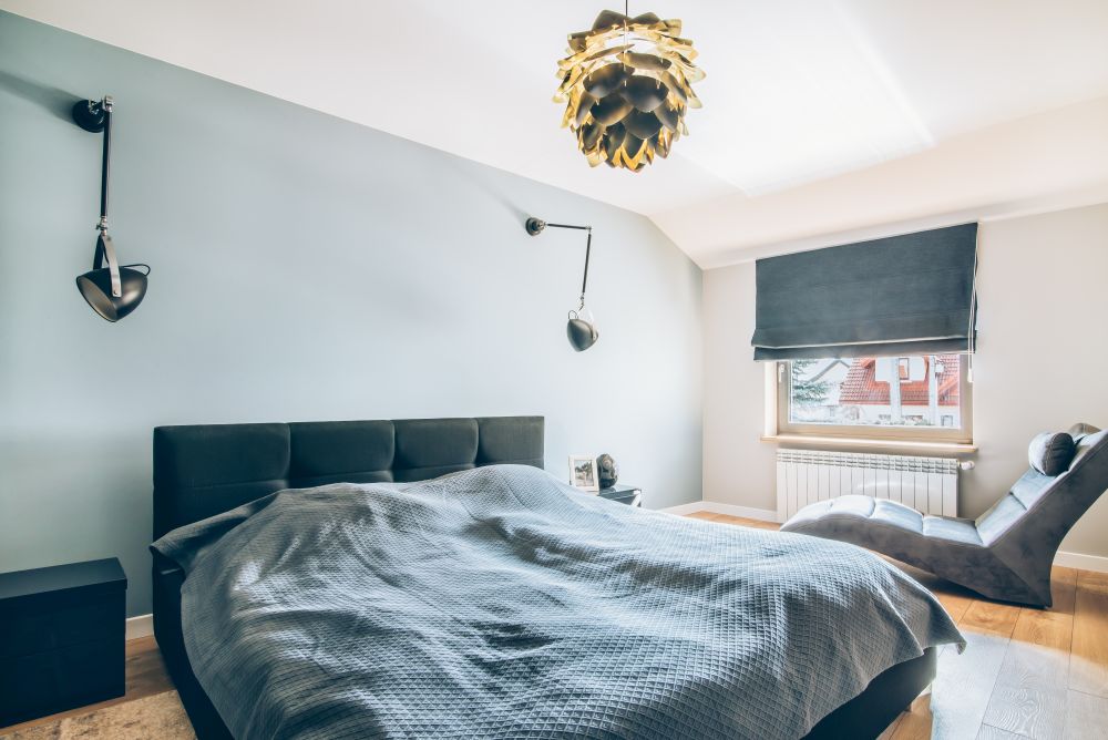 Sypialnia dla małżeństwa ceniącego komfort wypoczynku i przestrzeni. Połączenie subtelnego gołębiego koloru na ścianie z czarnymi dodatkami typu: industrialne kinkiety, ciekawa lampa wisząca, szafki nocne, sprawiają, że przestrzeń jest przytulna i zachęca do wypoczynku. Dodatkowe miejsce znalazł tutaj duży szezlong, na którym domownicy mogą odpocząć i przeczytać ciekawą książkę. Jednym z elementów, który nie został wymieniony jest przestronna zabudowa meblowa. Remont domu pod Białymstokiem.