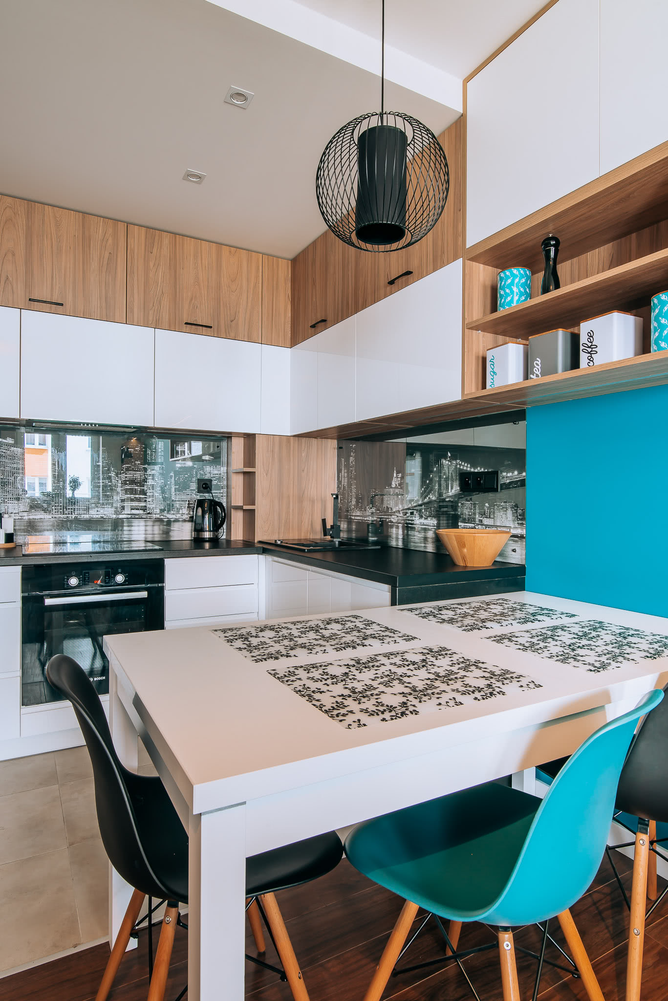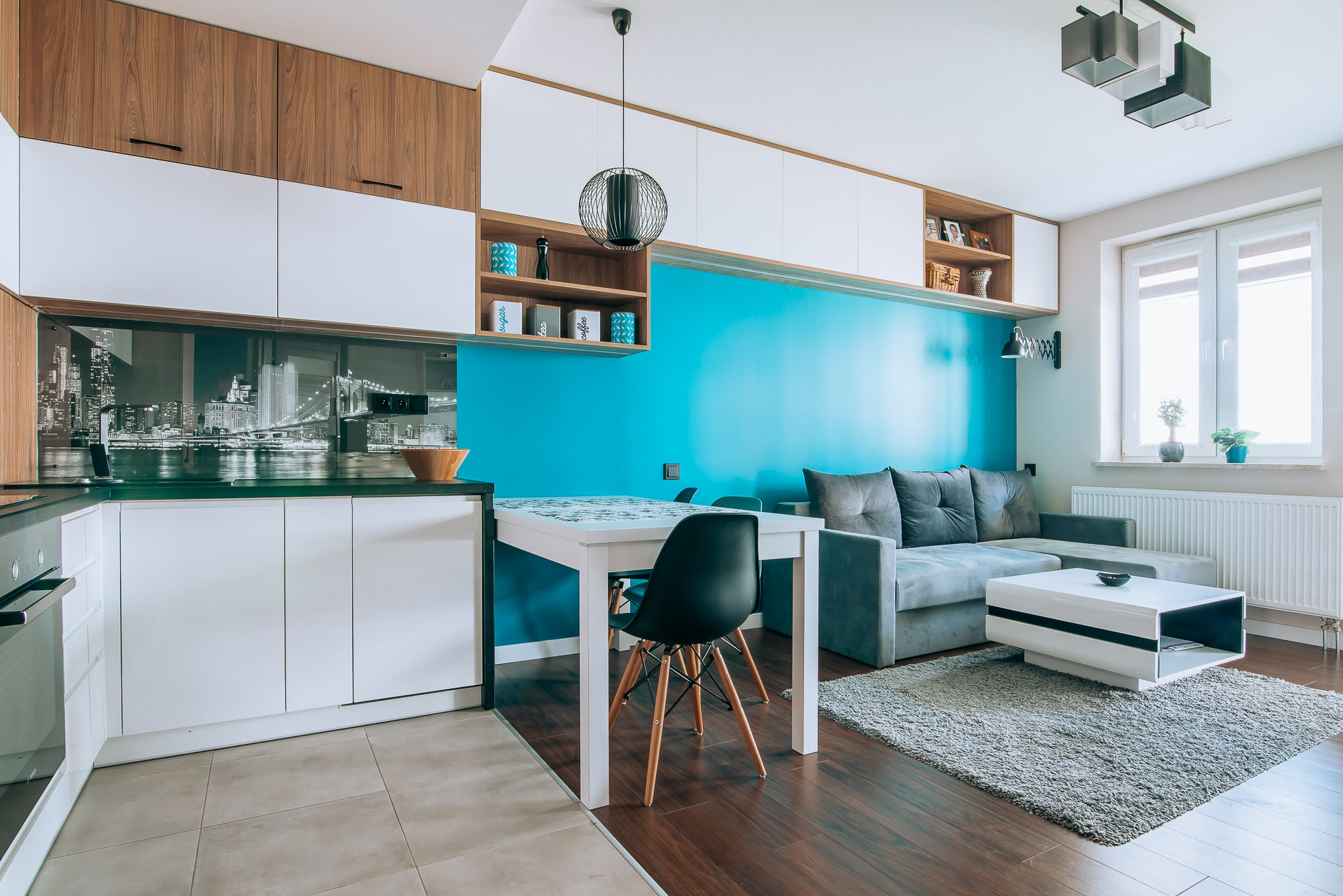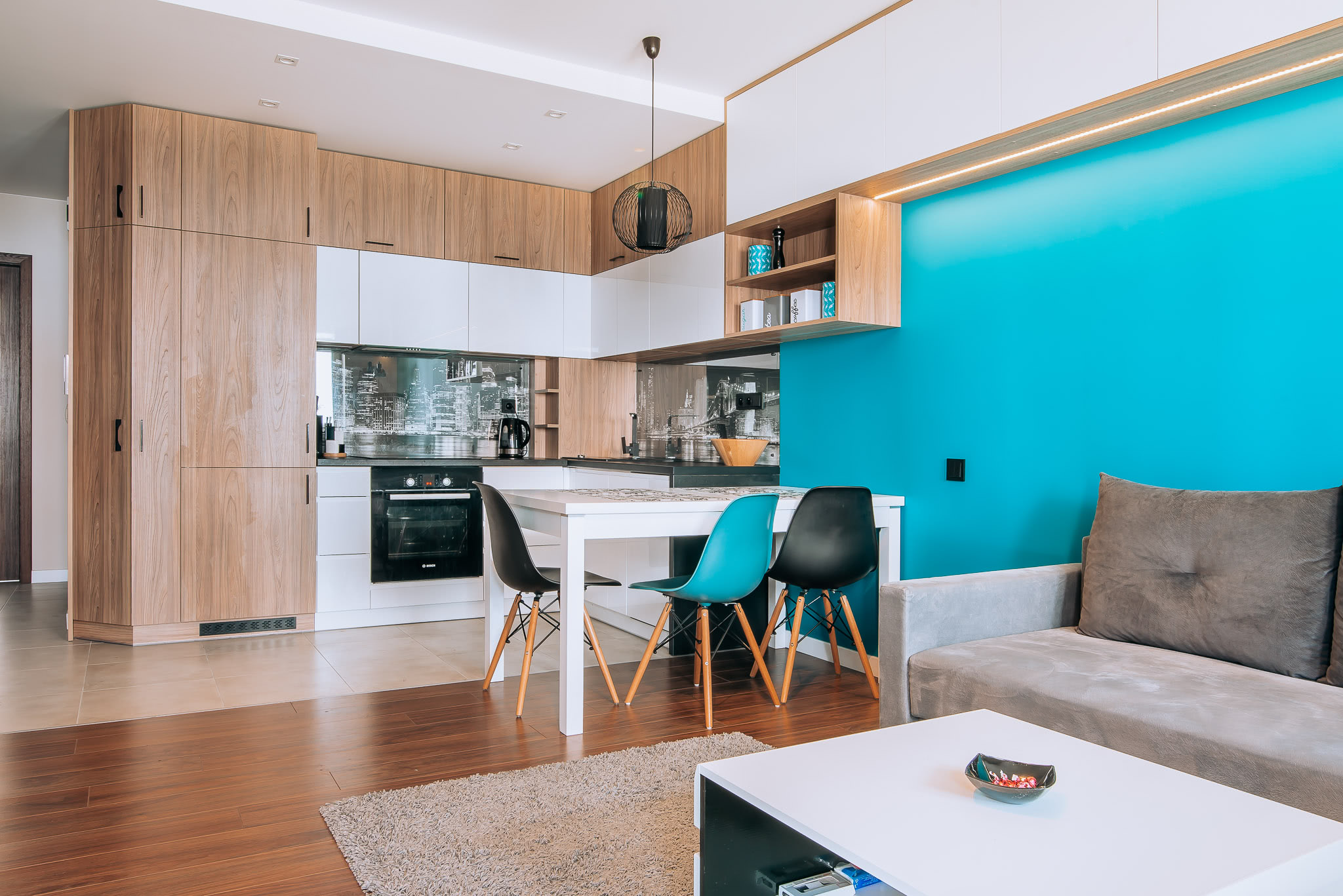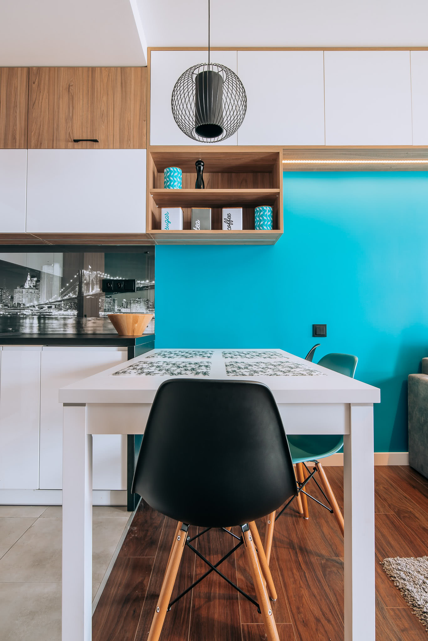 Salon połączony z kuchnią w niewielkim mieszkaniu. Zabudowa została wykonana w taki sposób aby pomieścić jak najwięcej na tak małej powierzchni. Turkus - ulubiony kolor właścicieli, znalazł się na ścianie za kanapą nieprzypadkowo, nadaje głębi wnętrzu i optycznie je powiększa.