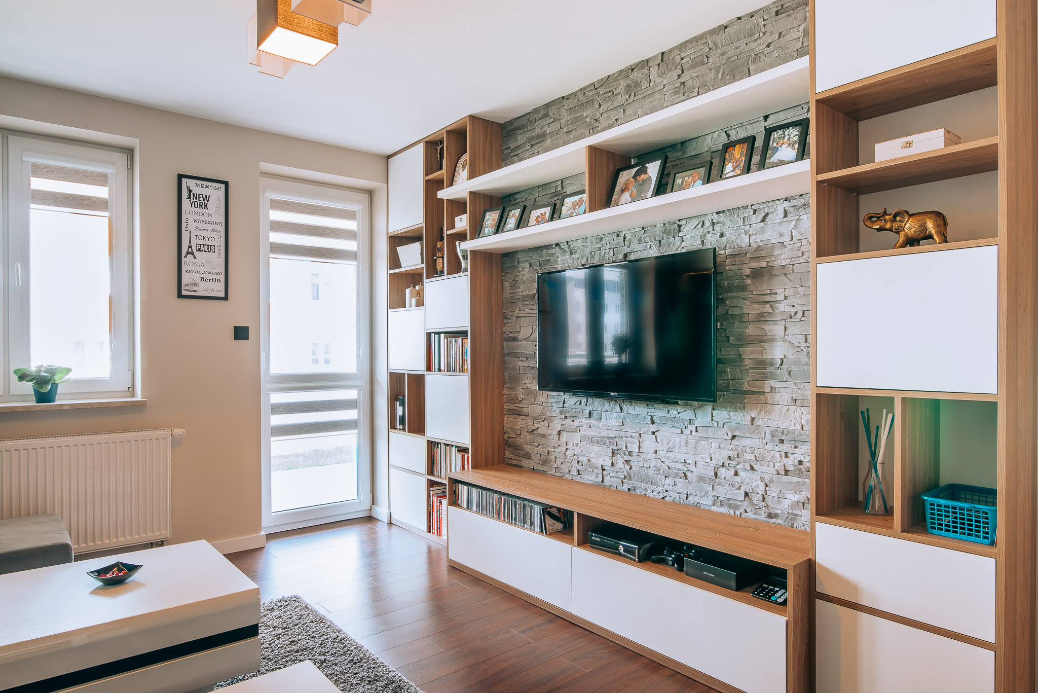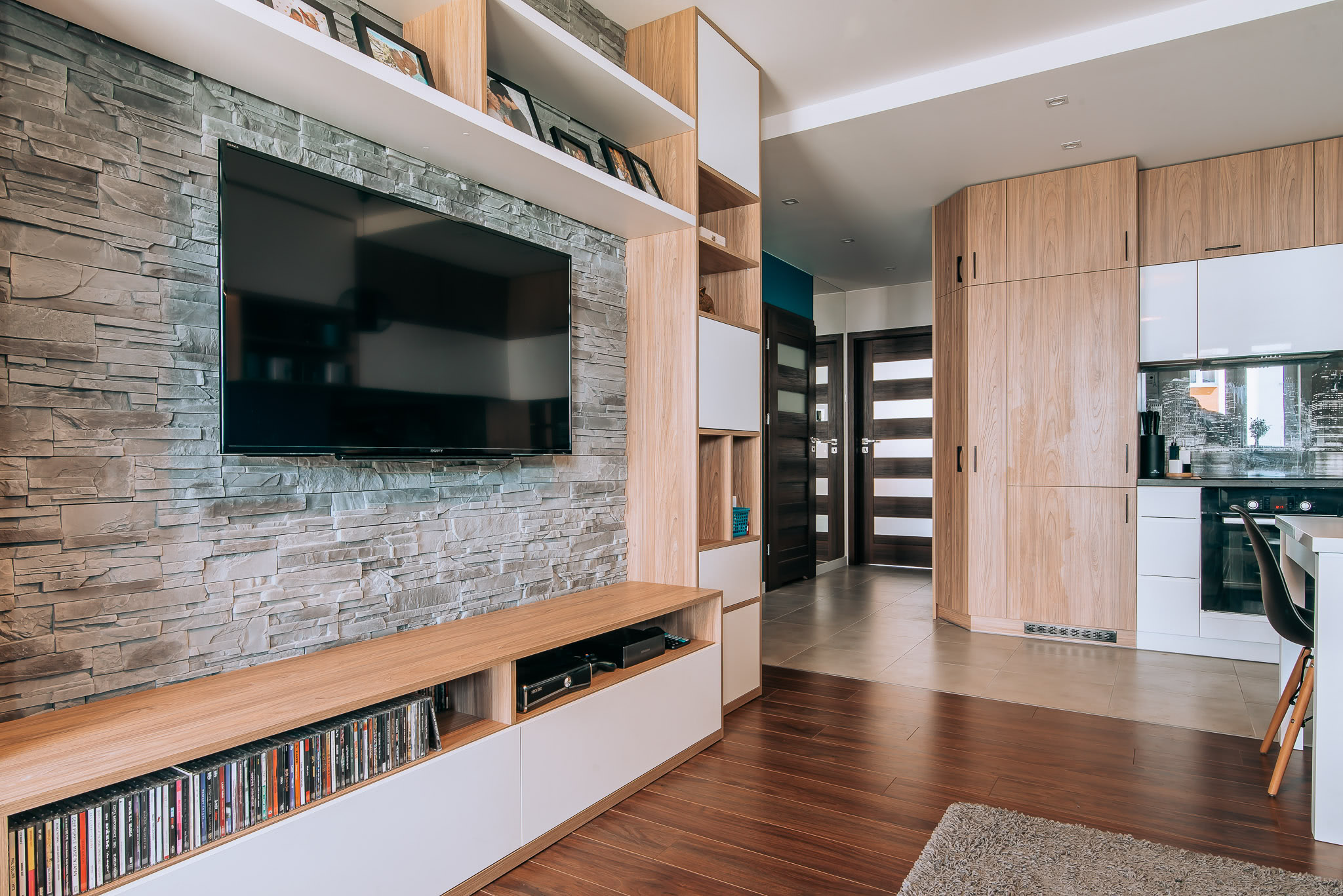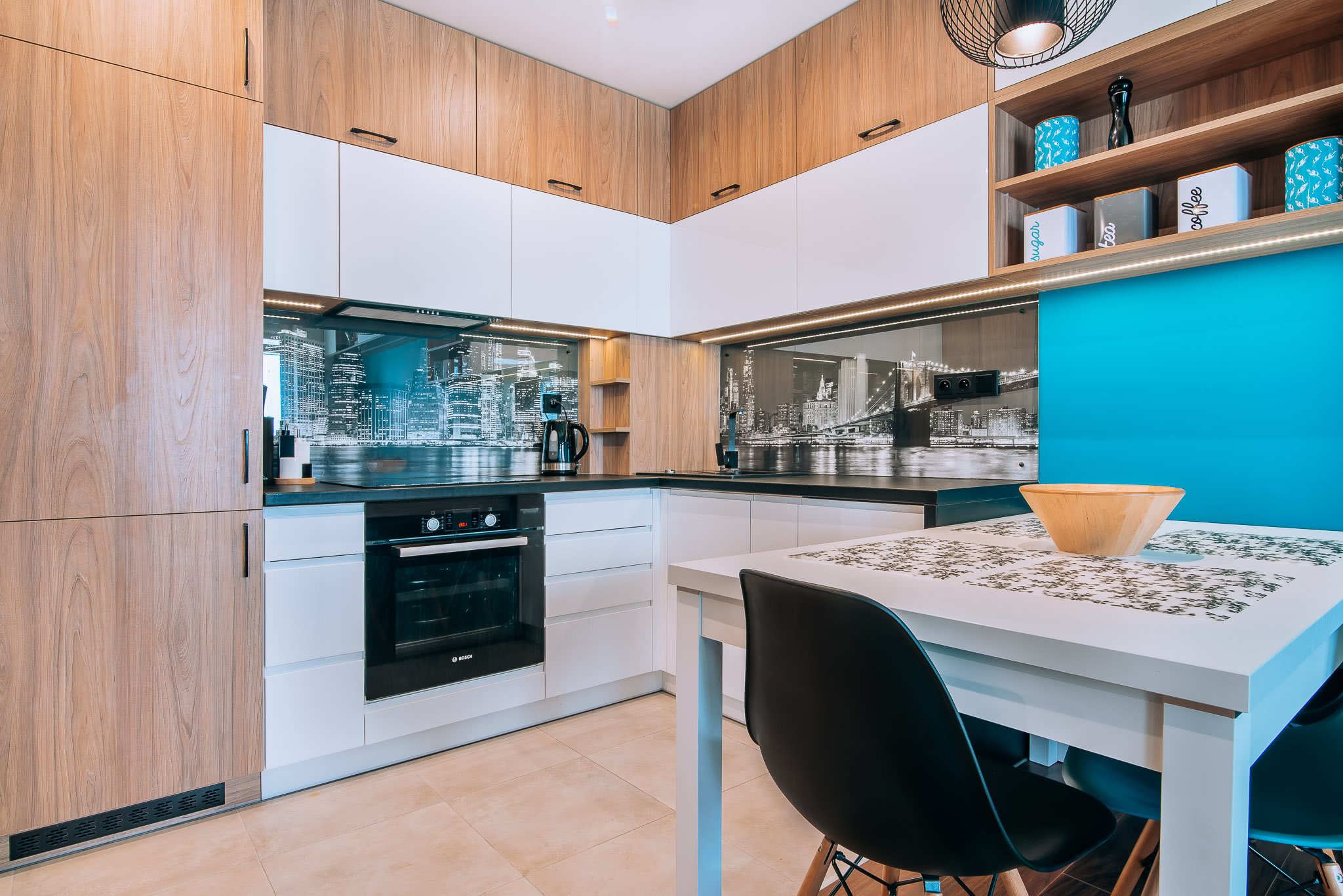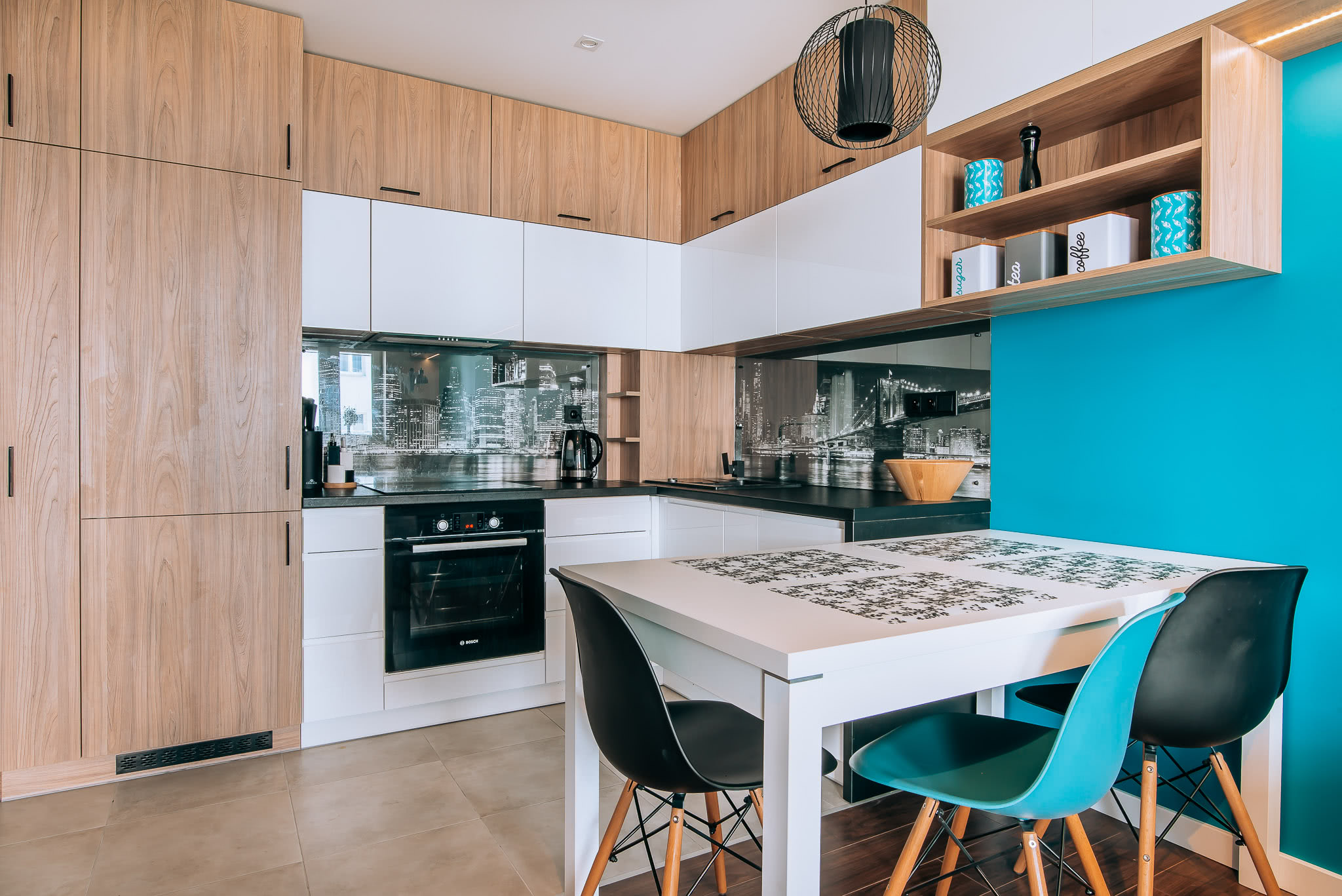 Salon połączony z kuchnią w niewielkim mieszkaniu. Zabudowa została wykonana w taki sposób aby pomieścić jak najwięcej na tak małej powierzchni. Turkus - ulubiony kolor właścicieli, znalazł się na ścianie za kanapą nieprzypadkowo, nadaje głębi wnętrzu i optycznie je powiększa.