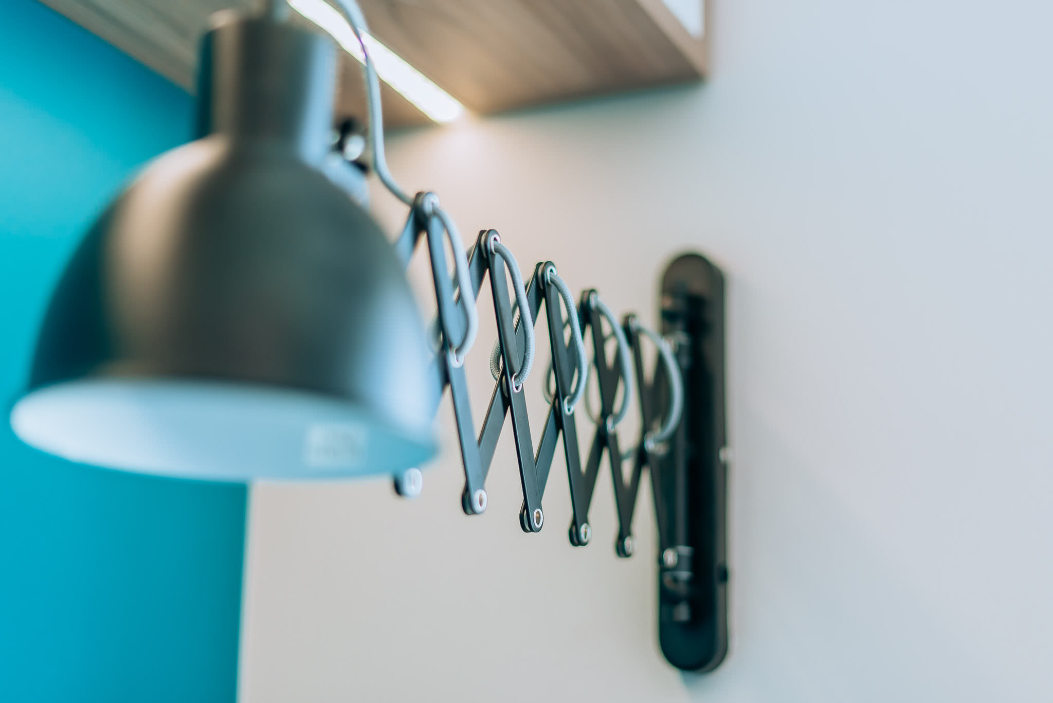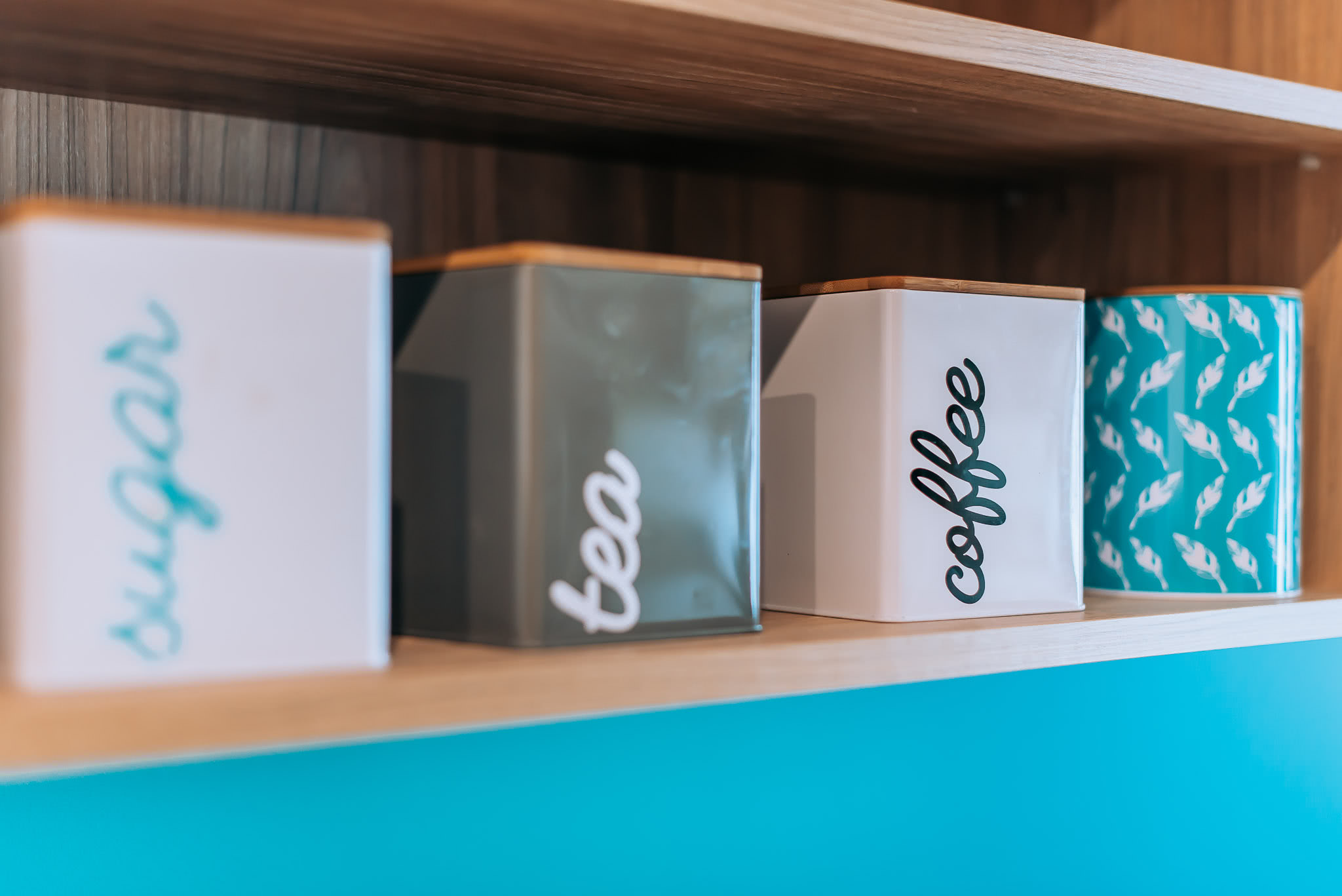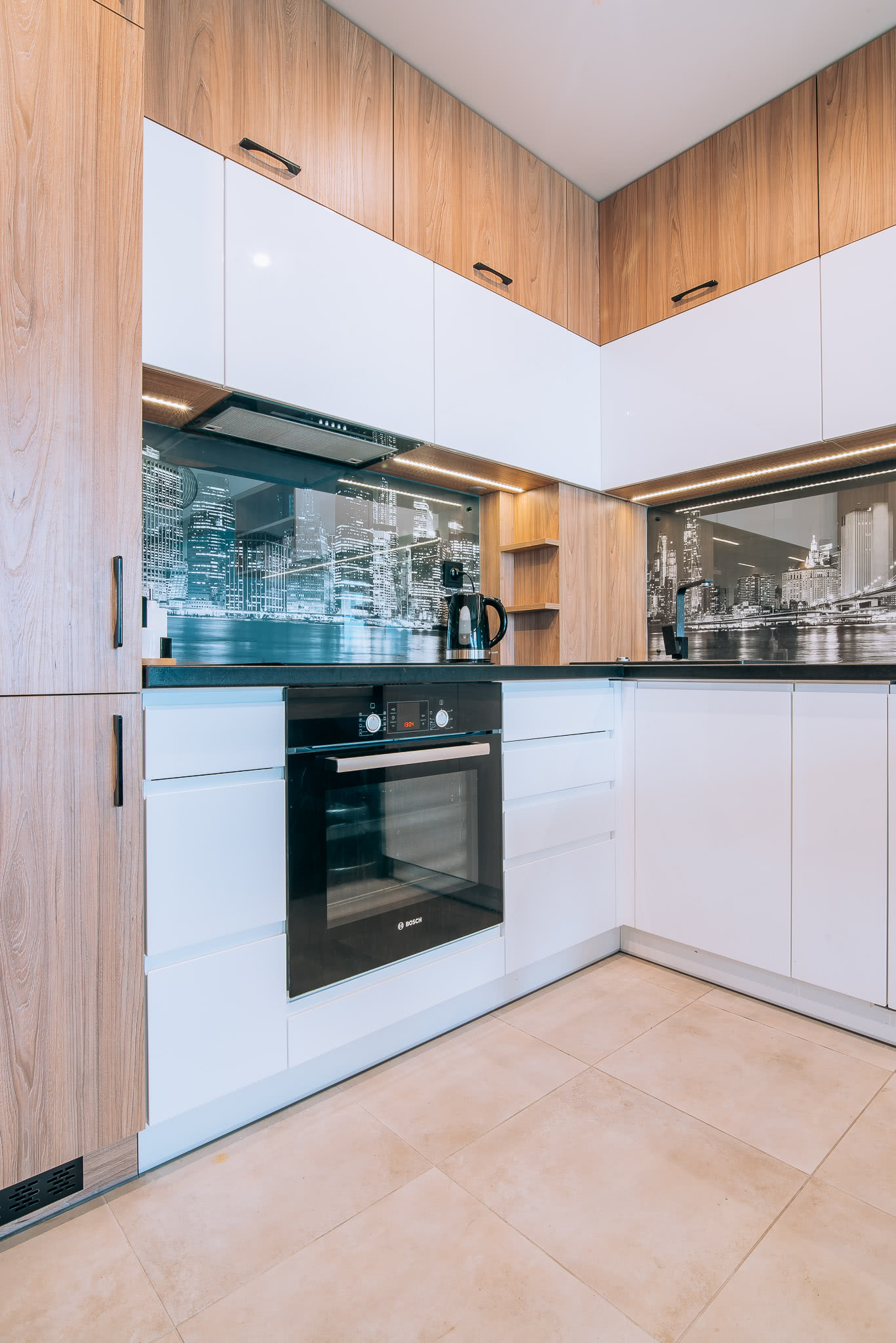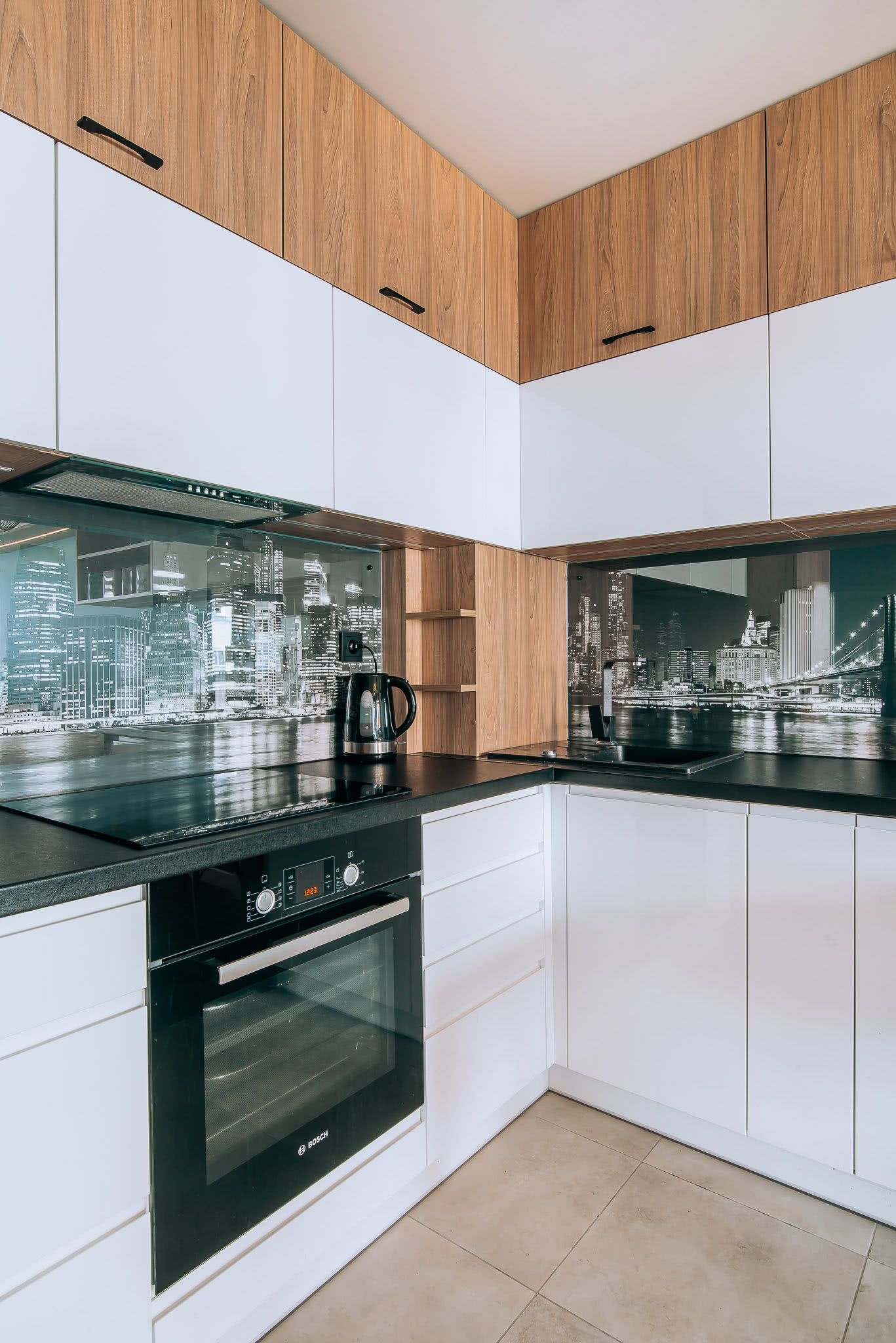 Salon połączony z kuchnią w niewielkim mieszkaniu. Zabudowa została wykonana w taki sposób aby pomieścić jak najwięcej na tak małej powierzchni. Turkus - ulubiony kolor właścicieli, znalazł się na ścianie za kanapą nieprzypadkowo, nadaje głębi wnętrzu i optycznie je powiększa.